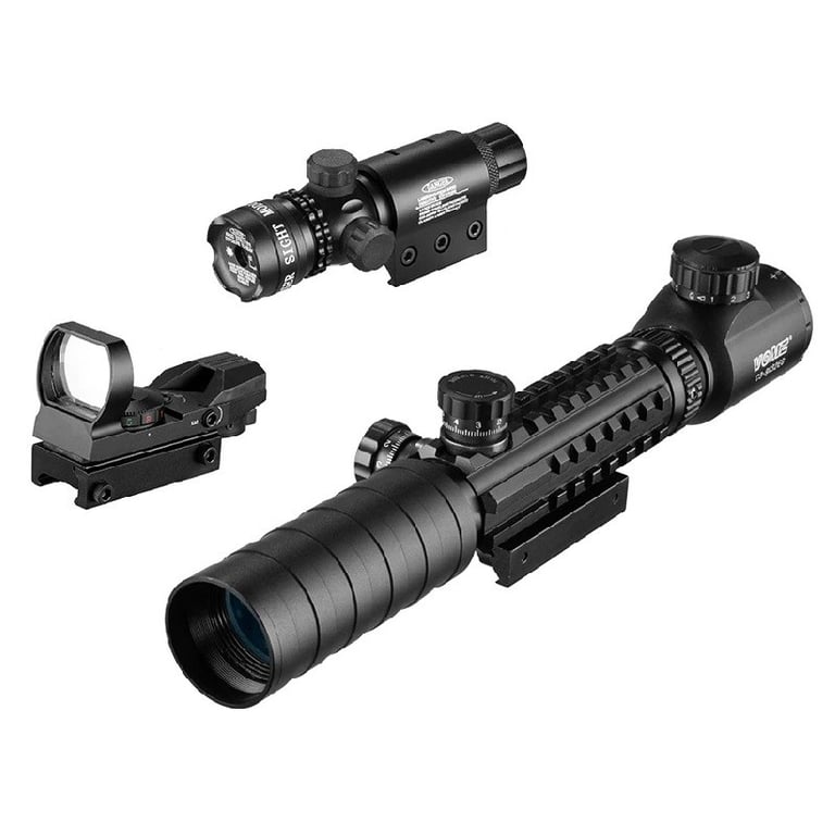 Package Contents: 1x rifle scope, 1x collimator, 1x red laser