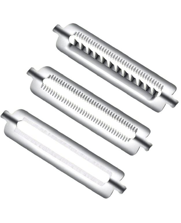 Highly multifunctional peeler with three different blades to suit your needs. No matter what you are peeling, just select the right blade on the peeler and the task will be easier. Blades can be changed simply by turning the central wheel. No complicated assembly or blade changes. Just easily turn the wheel and keep peeling.