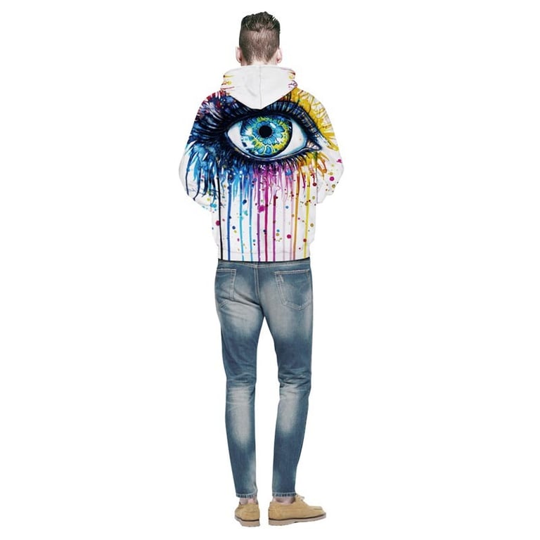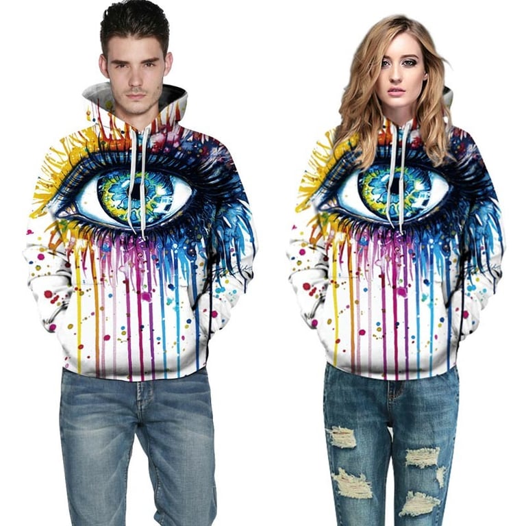 The sweatshirt with an interesting 3D print of a human eye will delight both men and women.