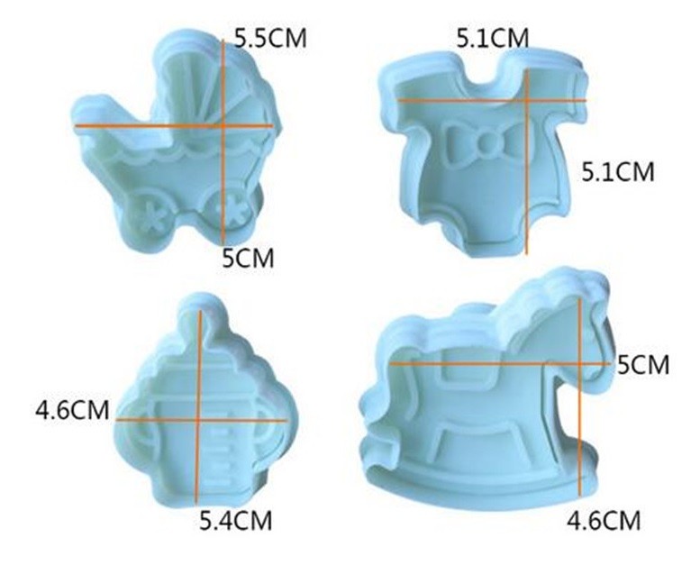 Dimensions: pram 5.5 x 5 cm, bodysuit 5.1 x 5.1 cm, bottle 5.4 x 4.6 cm, horse 4.6 x 5 cm