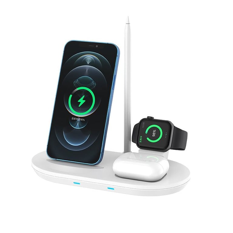 You can place your iPhone, Apple Watch, AirPods, and Apple stylus on the charging station simultaneously.
