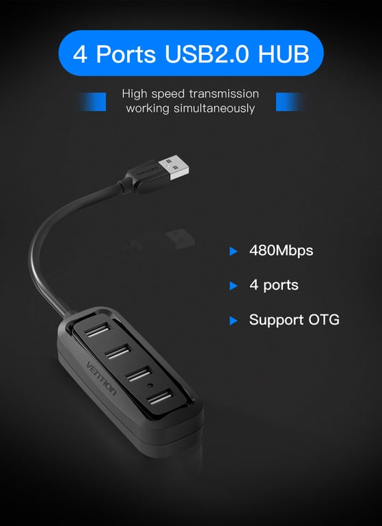 4-port USB 2.0 HUB with LED light indicator - Black