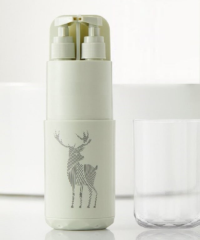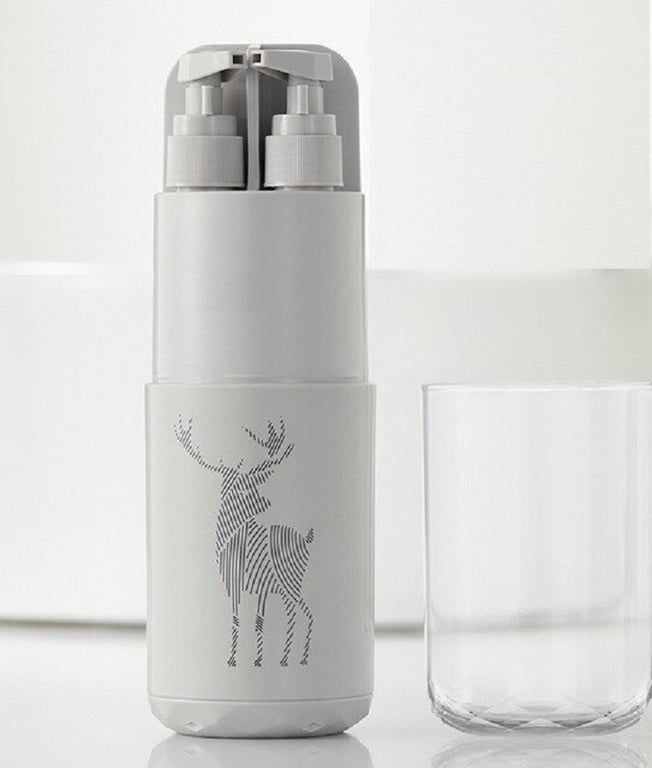 Includes space for a toothbrush and toothpaste, a cup, a small comb, a mirror, and two containers for items such as shampoo and shower gel.