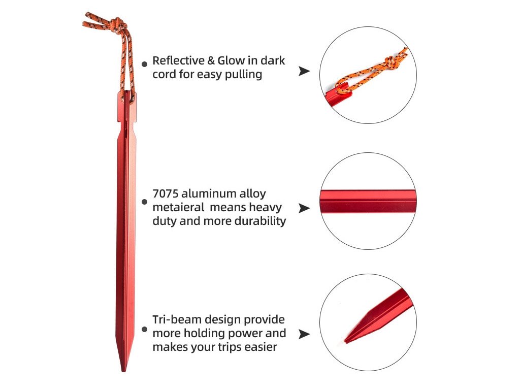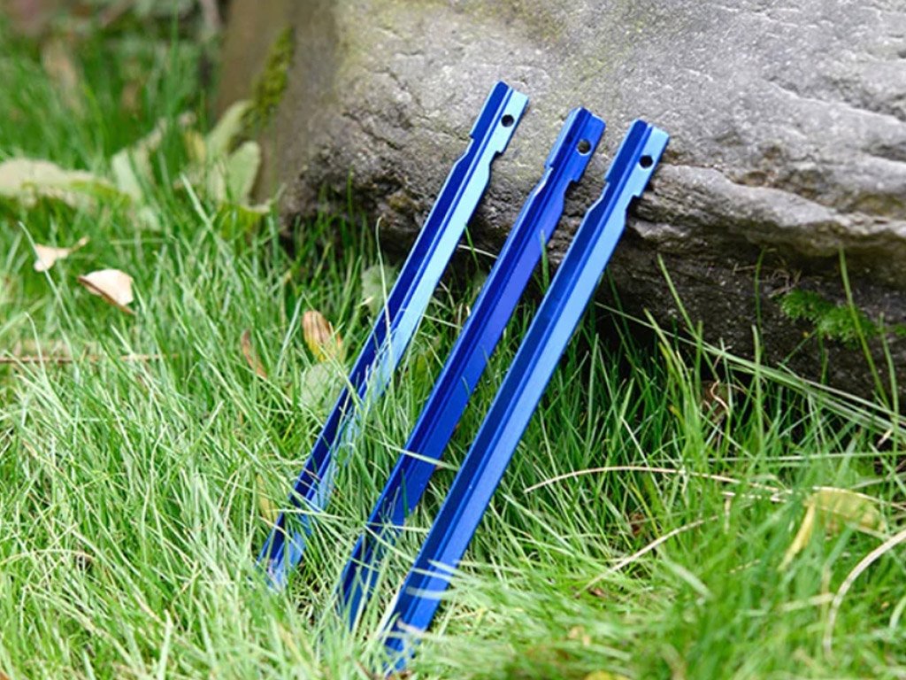 Ultralight aluminium tent pegs stand out for their strength, which you will appreciate on harder terrain, and their weight of just 13 g each, which you will value most on a long hike.