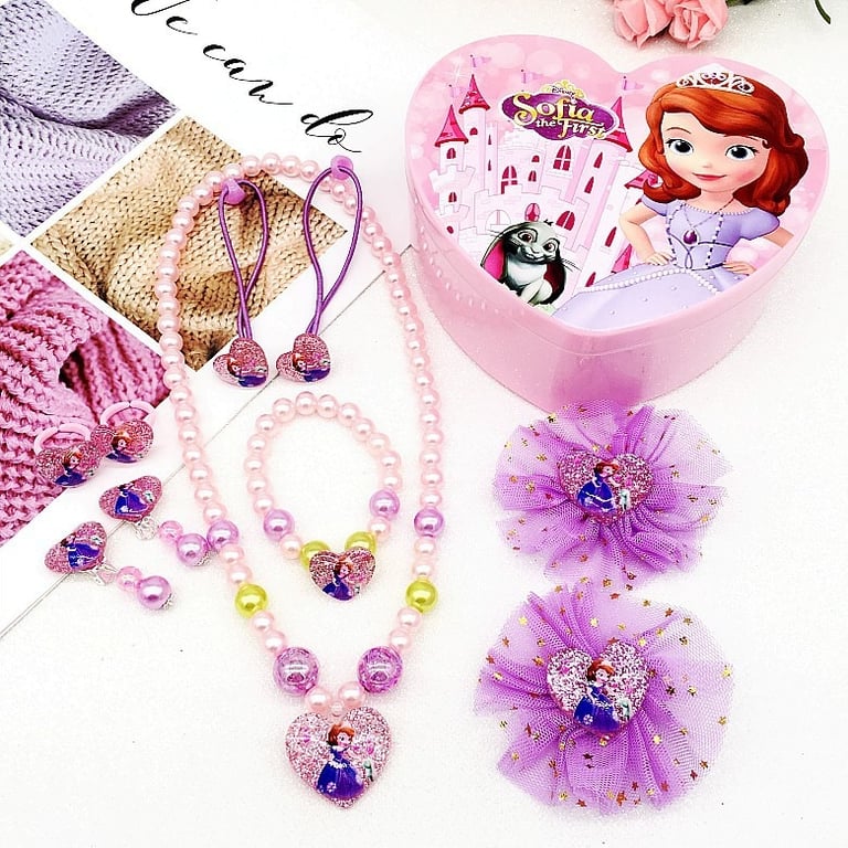 • Inside you will find a large necklace, a bracelet, 1 pair of earrings, 2 hair ties, 2 rings, 2 clips