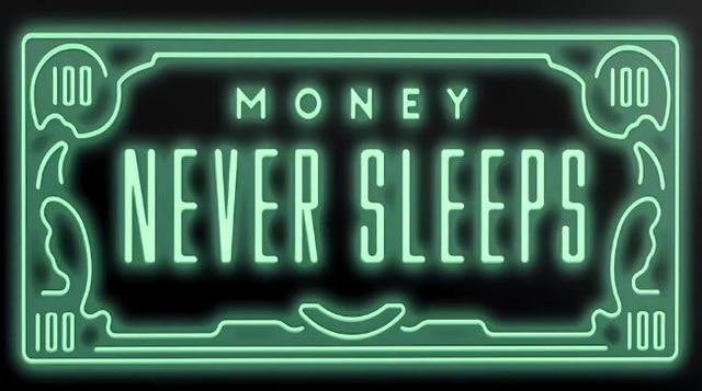 A picture with the inscription "Money never sleeps."