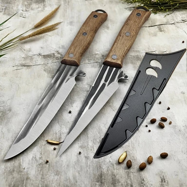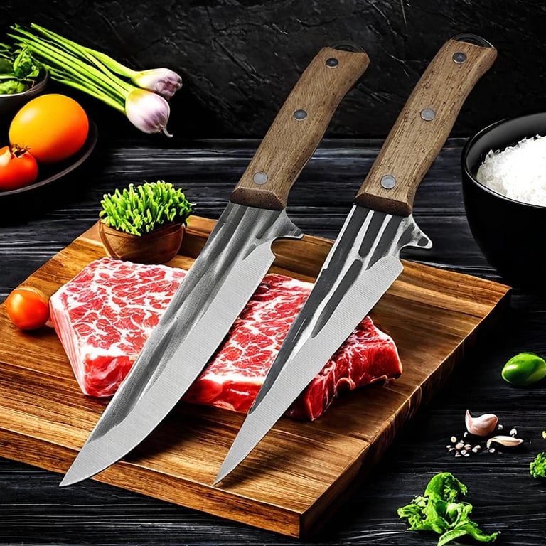 These kitchen knives with wooden handles feature sharp stainless steel blades and a practical design for everyday use. Thanks to their shape, they are suitable for both meat portioning and general slicing of vegetables or other ingredients.