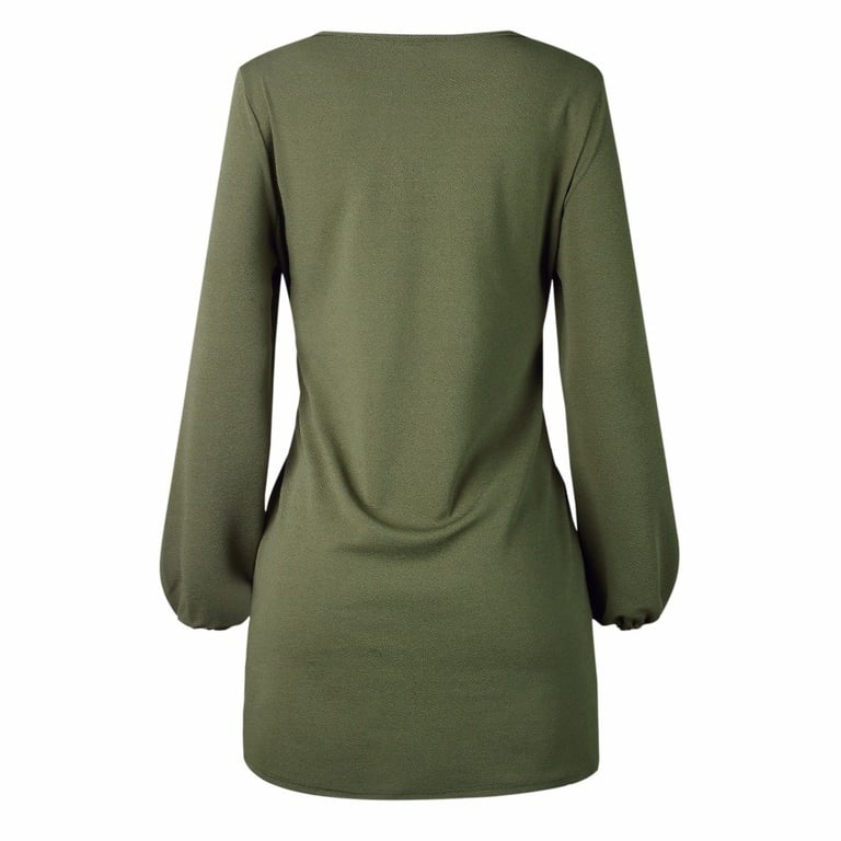 Round neckline and long gathered sleeves.