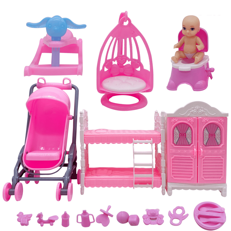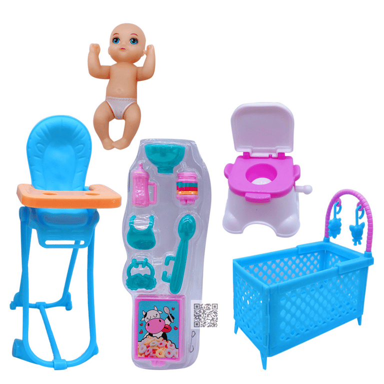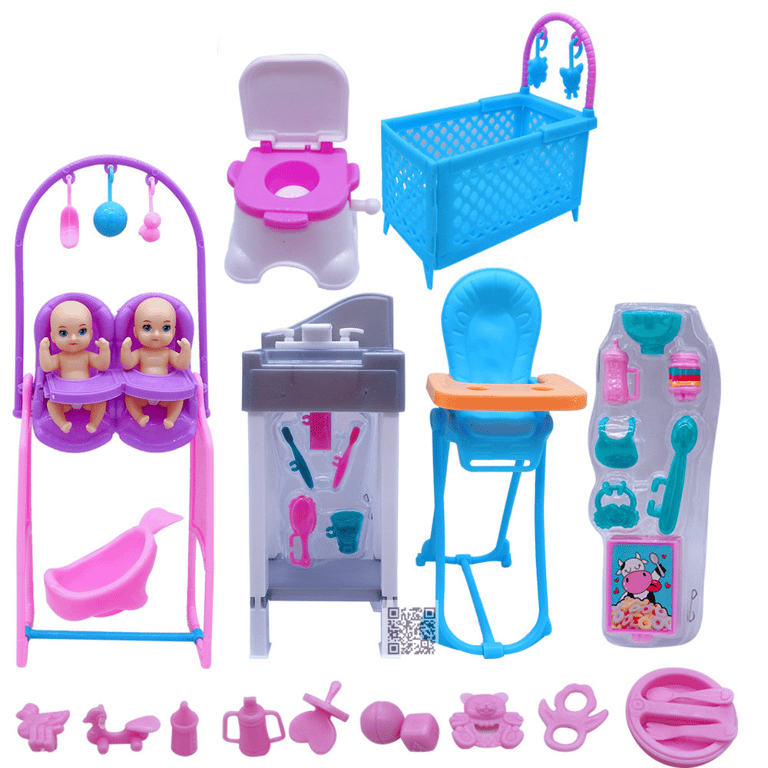 Accessories suitable for Barbie dollhouses. The set includes a table, toilet, stroller, small doll, crib, etc. see photo.
