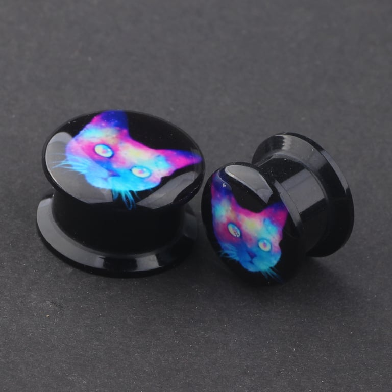 Acrylic screw-on plug with a holographic cat. The package contains 2 pieces.