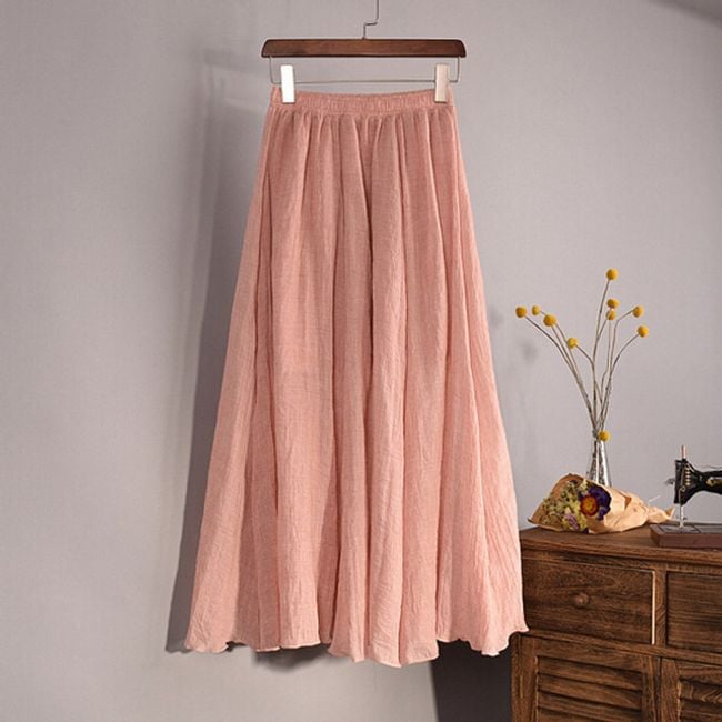 The airy summer skirt is in a very pleasant length down to the ankles. Thanks to the elastic waistband, the skirt fits absolutely everyone. The comfortable linen material, which does not need ironing, will be appreciated by every woman. The skirt is available in all colours and comes in one universal size. You can find the dimensions at the bottom of the page under product specifications.
