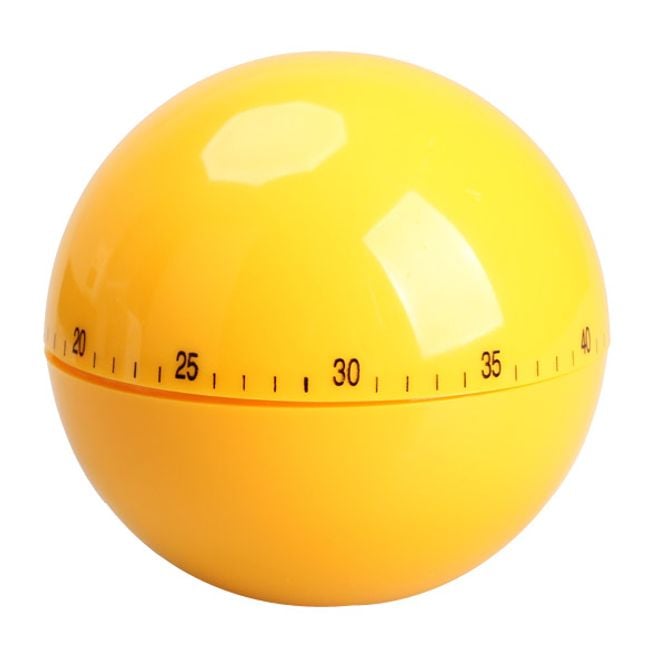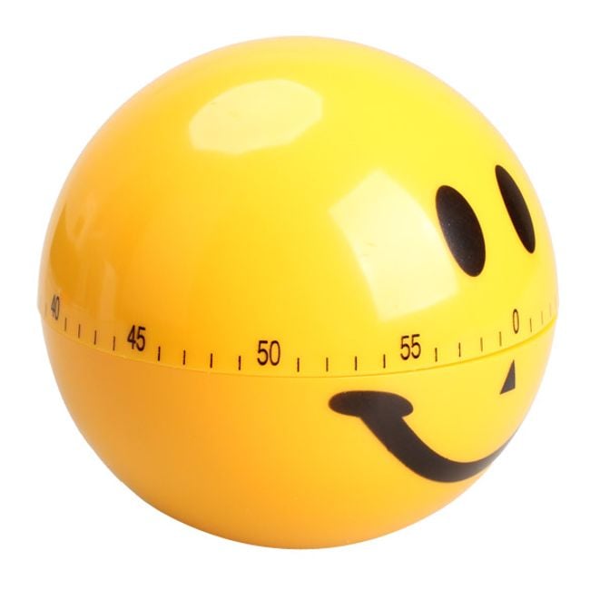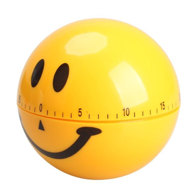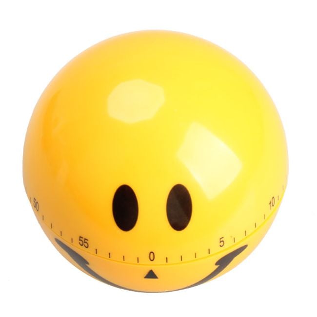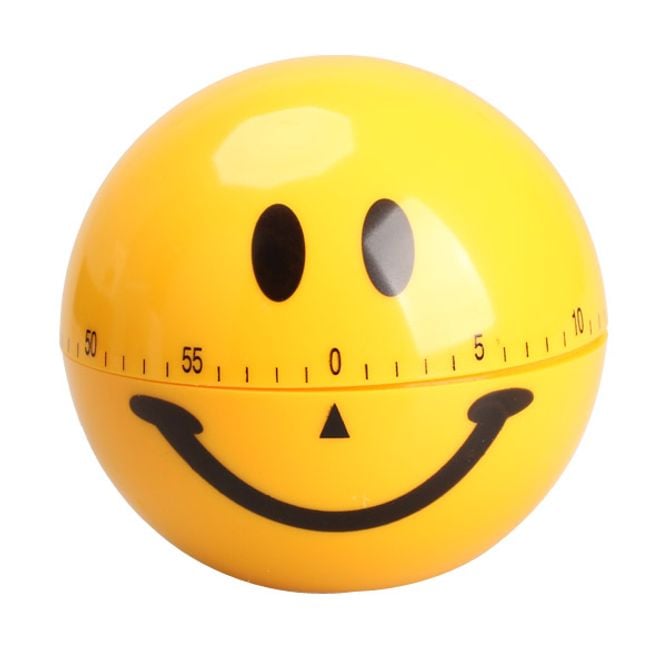 The yellow smiley face alarm clock serves as both a tool and an accessory for the kitchen.