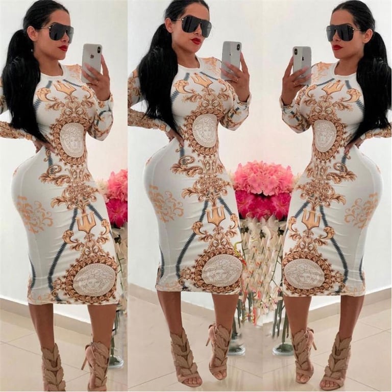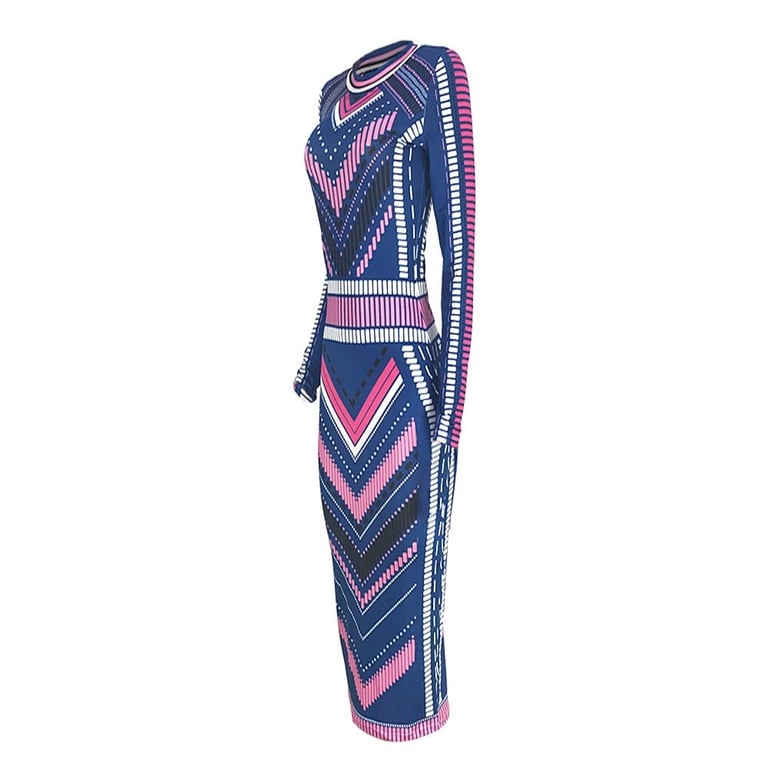 Women's midi-length dress with a round neckline and long sleeves.