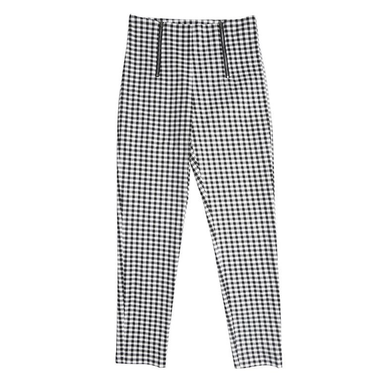 Stylish women's trousers with a black and white check pattern. High waist and two decorative zips on the sides. Comfortable and pleasant material.