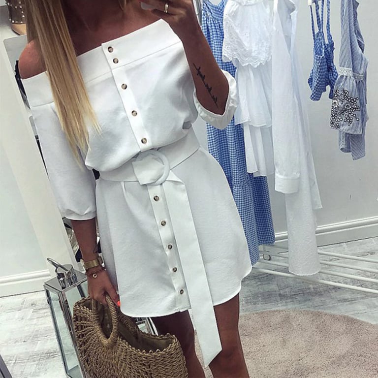 Women's dress with a striped pattern. The dress features a neckline with exposed shoulders. Loose fit with button fastening and a belt with a buckle. Available in multiple variants.