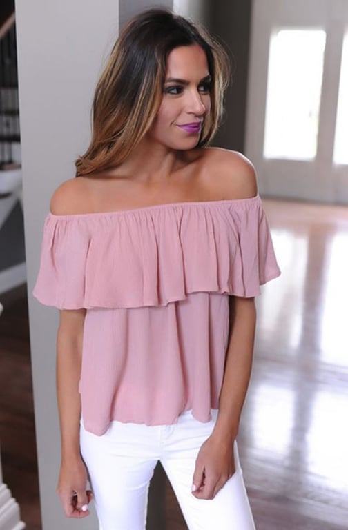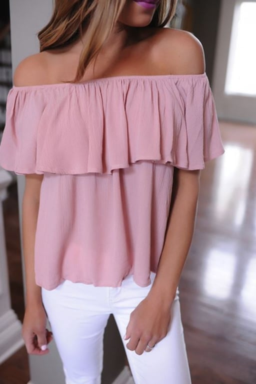 An interestingly designed pink women's off-shoulder top.