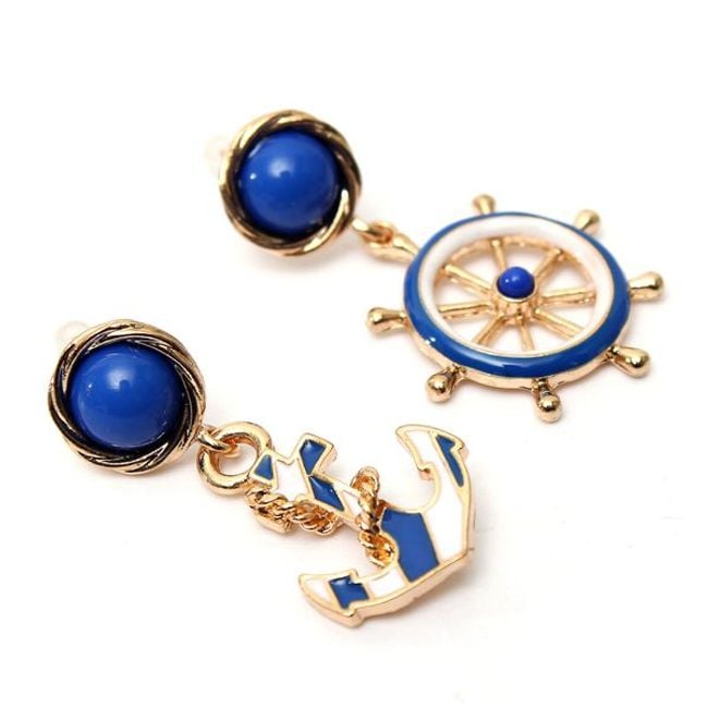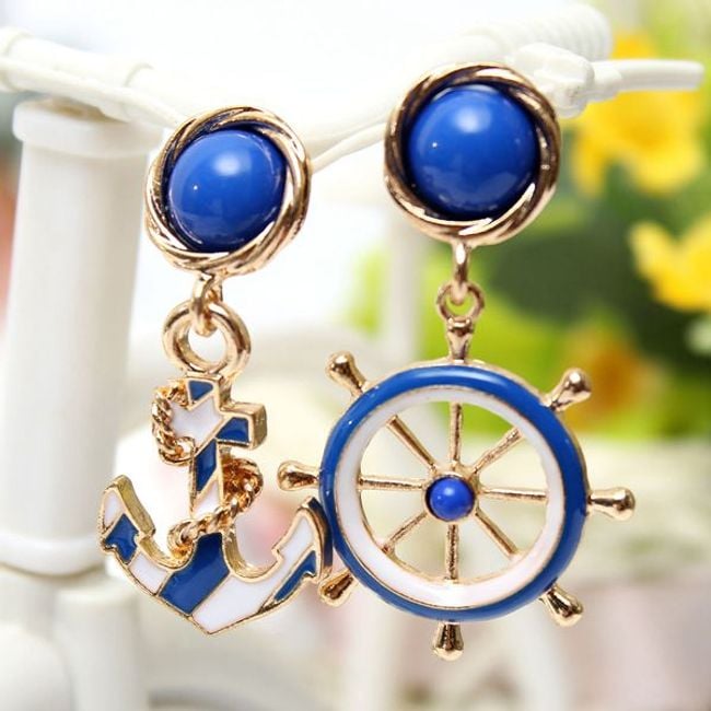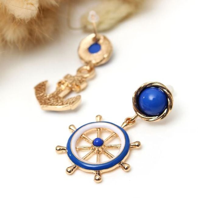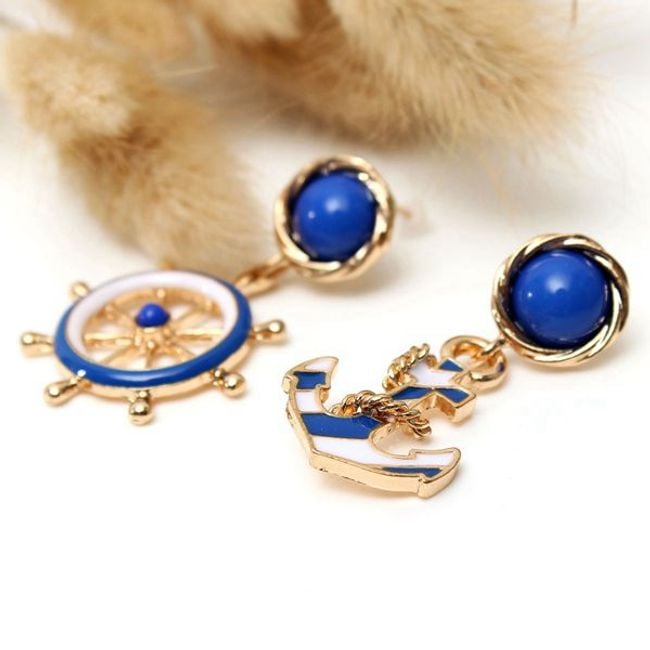 Asymmetrical earrings that combine gold, blue, and white colours. One earring is adorned with a ship's wheel, while the other features an anchor. They are suitable for an elegant style of clothing.