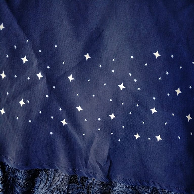 Asymmetrical ruffle with a delicate star print and lace embellishment.