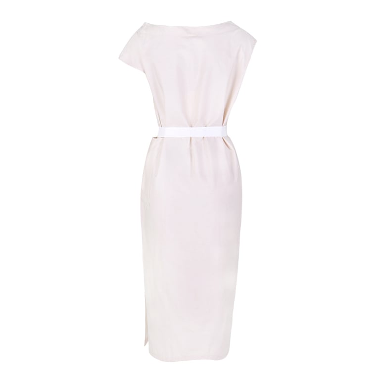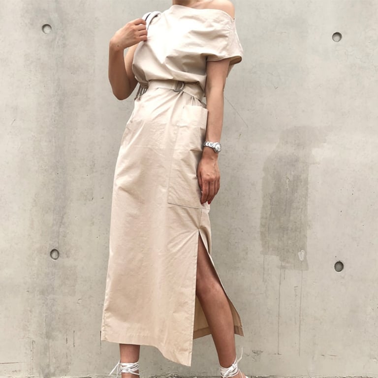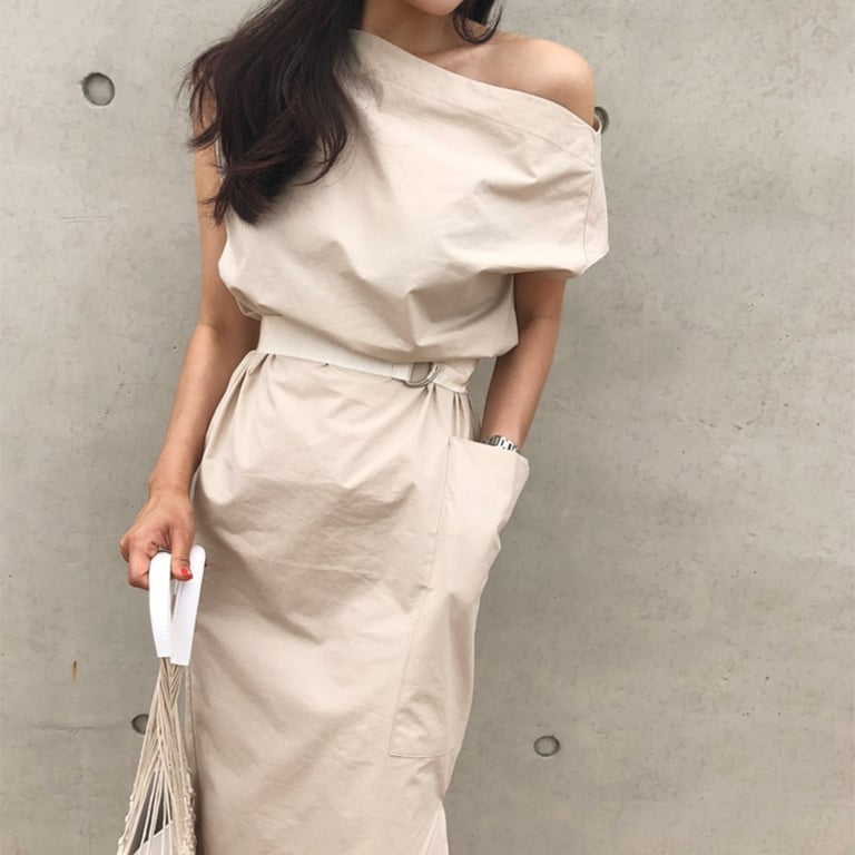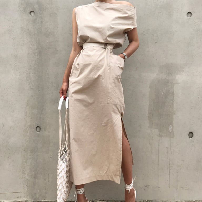 Long summer dress with asymmetrically designed shoulders.