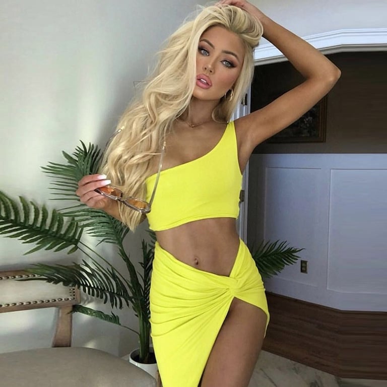 Sexy mini skirt and asymmetrical one-shoulder top.