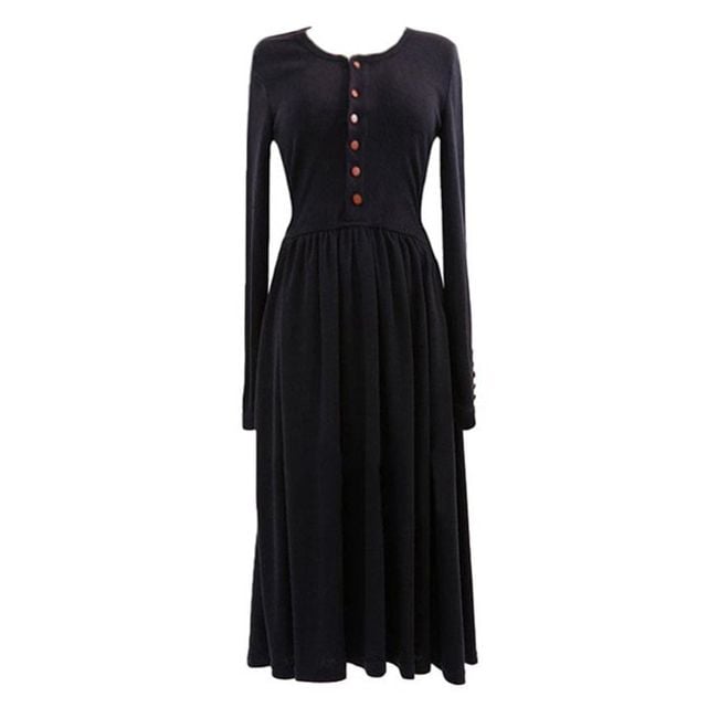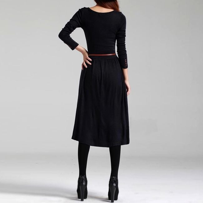 The dress is solid-coloured, featuring a stylish cut that reaches approximately above the knee, buttons on the chest, and a thin belt at the waist. It is suitable for everyday wear during autumn and winter, whether for work, school, or social events.