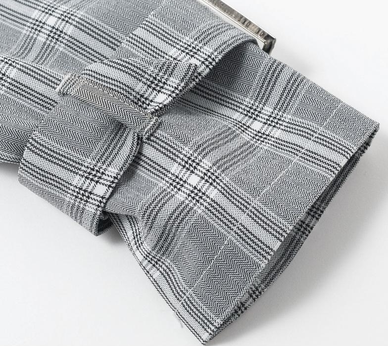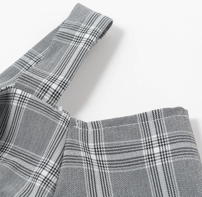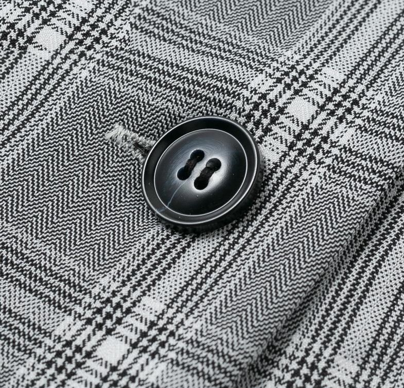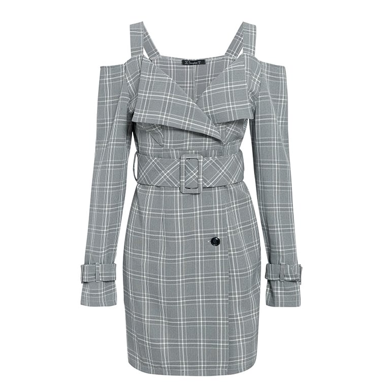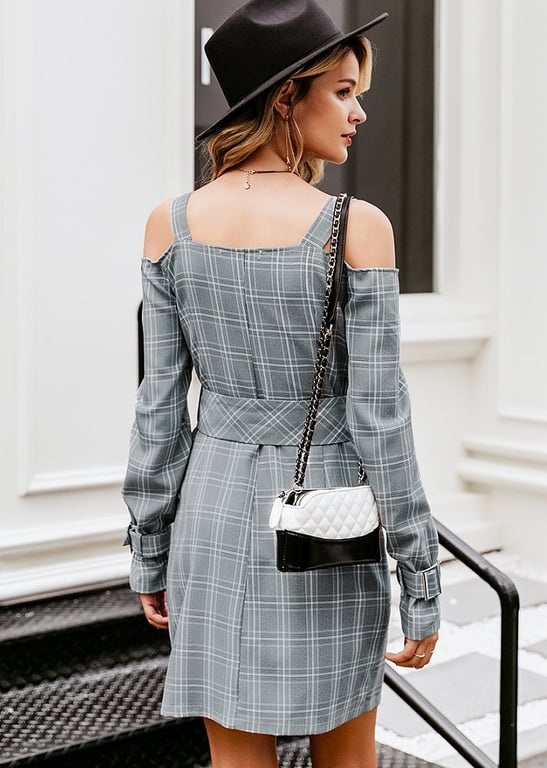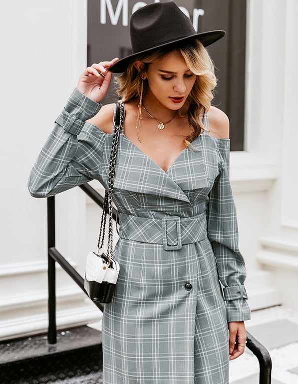 Modern checkered pattern. Coat cut with a belt and cuffs.