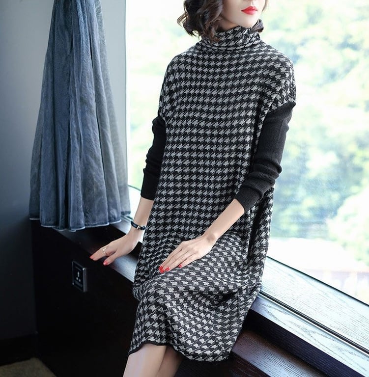 Elegant women's autumn dress with long sleeves and a roll neck.