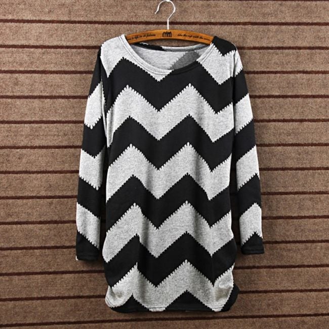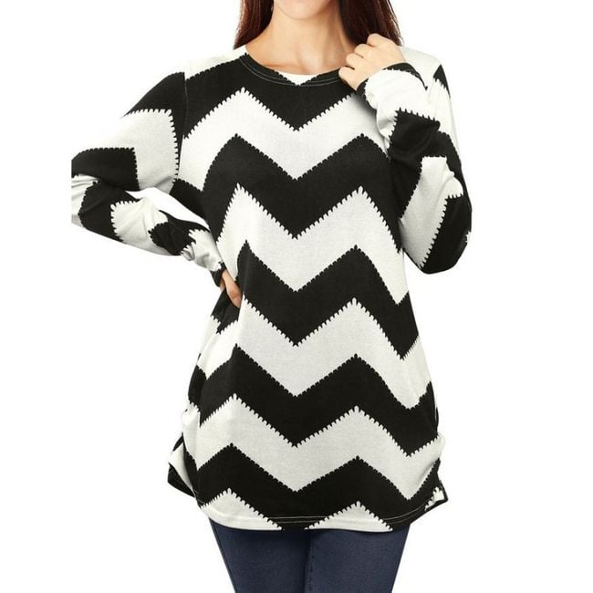 The long sweater is perfect for leggings or skinny jeans. It is not insulated, making it suitable for autumn when the sun doesn't warm as much, but it doesn't freeze. The zigzag stripes look interesting and will give your figure a slimmer appearance. It is made in one universal size – please refer to the product description for measurements.
