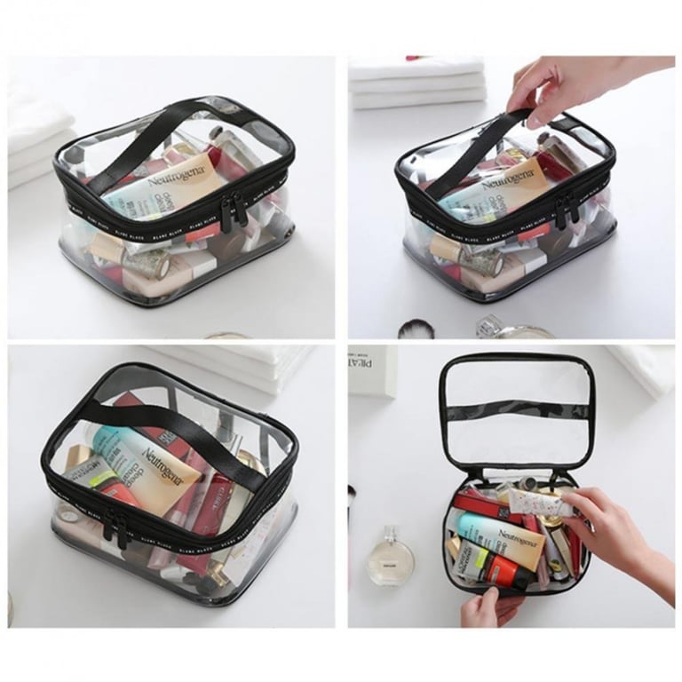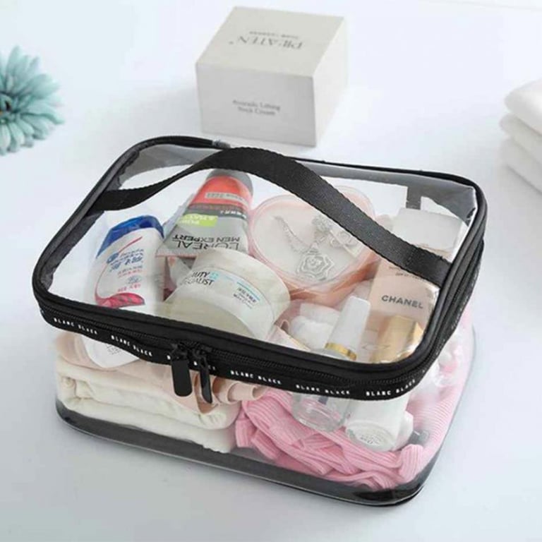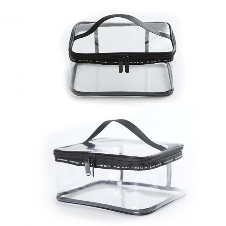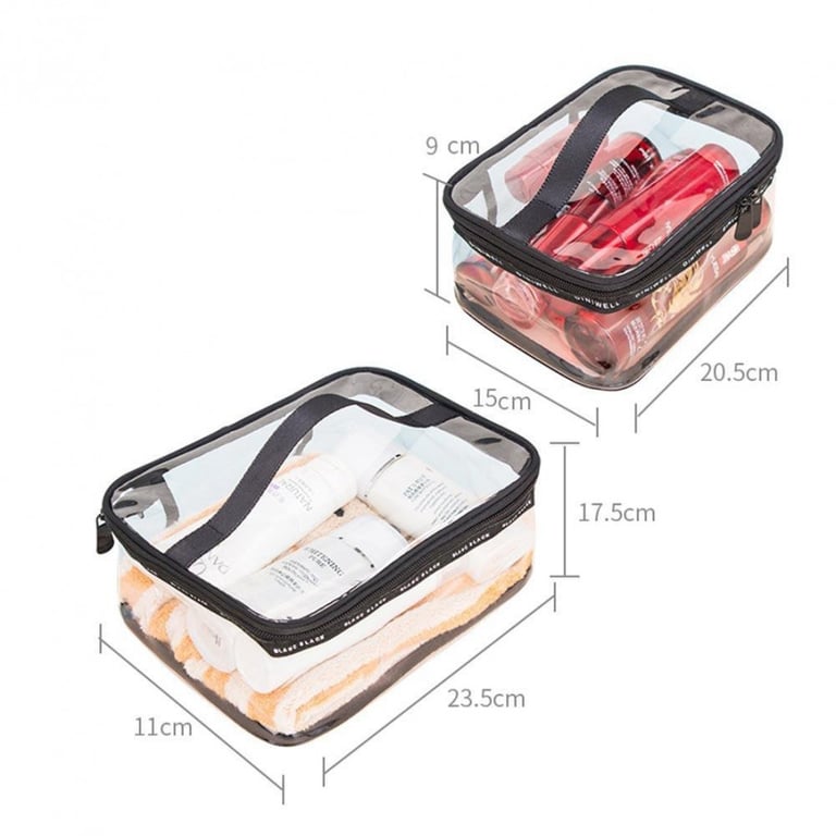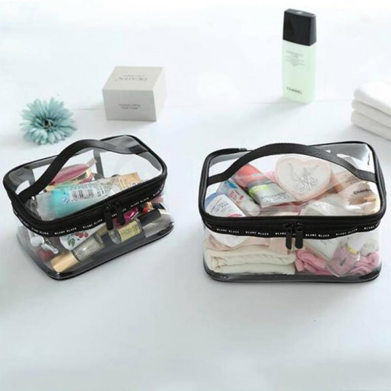 Transparent cosmetic pouch with a zip closure and handle. Ideal for travel. Available in two sizes.