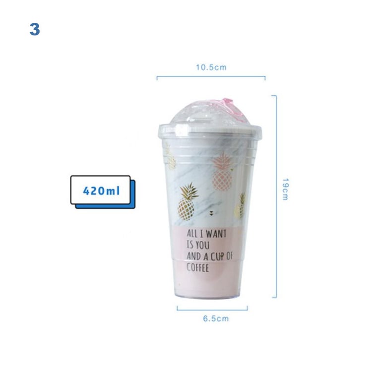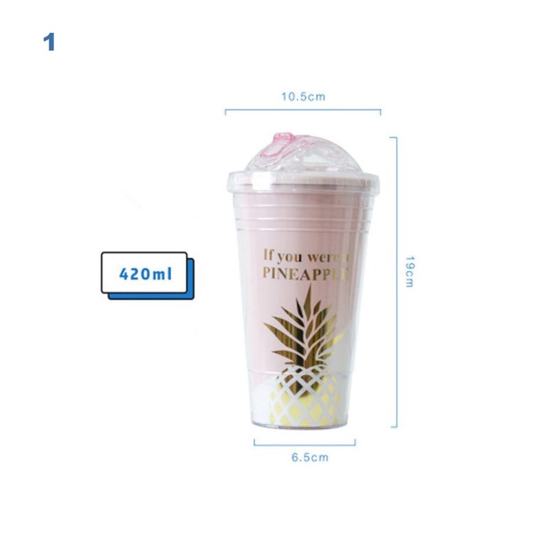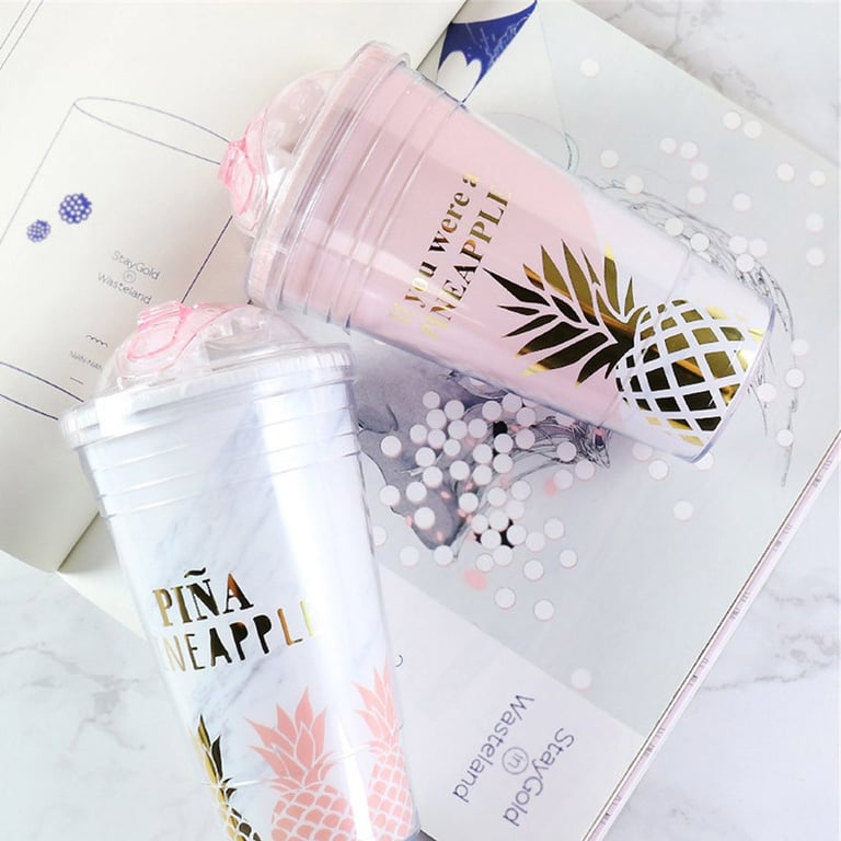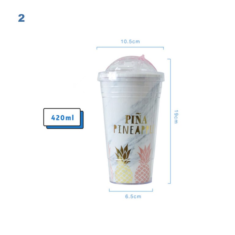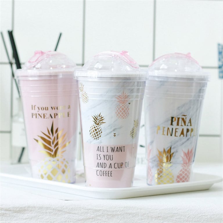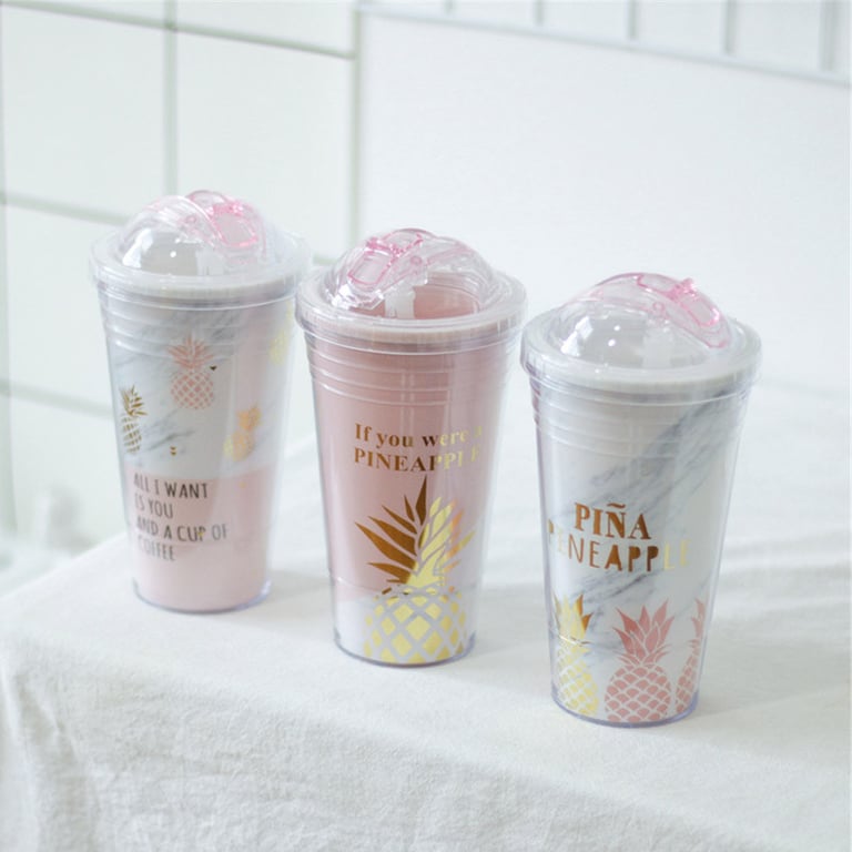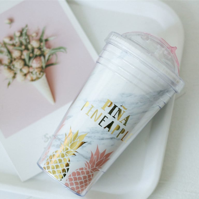 Travel mug with a tropical pineapple design. Sealed lid with a straw opening. Available in three variants.