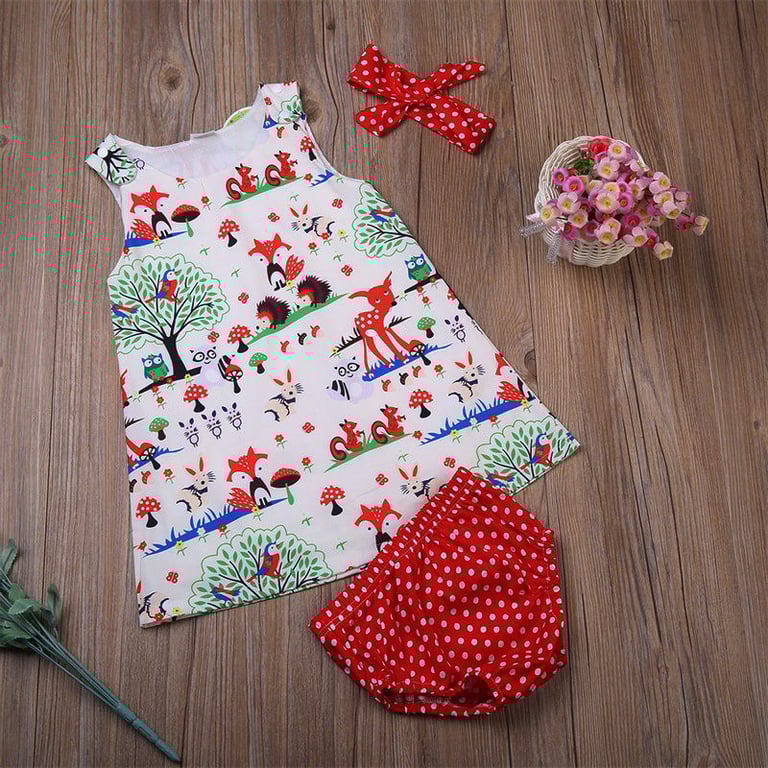 Baby girl's dress featuring animal motifs, a headband, and red polka dot knickers that beautifully cover the nappy.