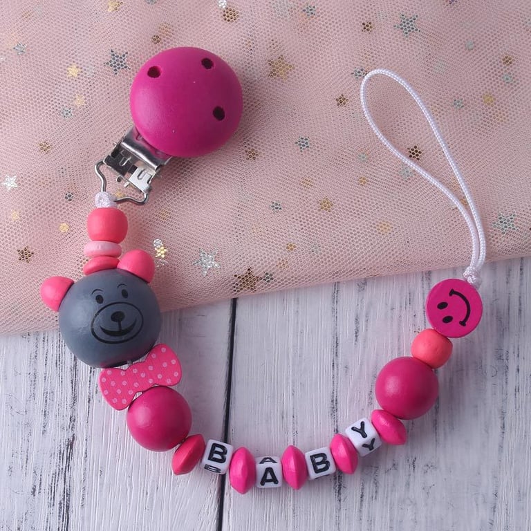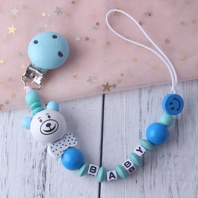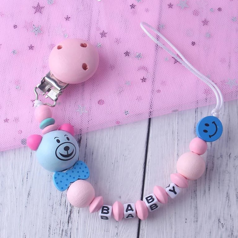 Children's wooden pacifier clip with an animal and letters spelling the word BABY – child. The clip looks very cute.