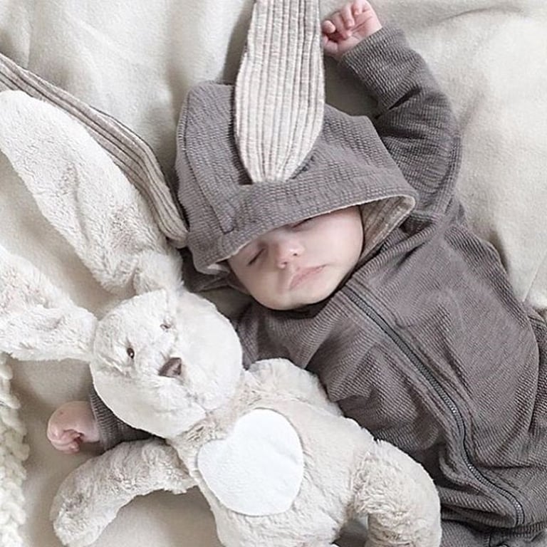 Beautiful baby overall with ears like a little bunny.
