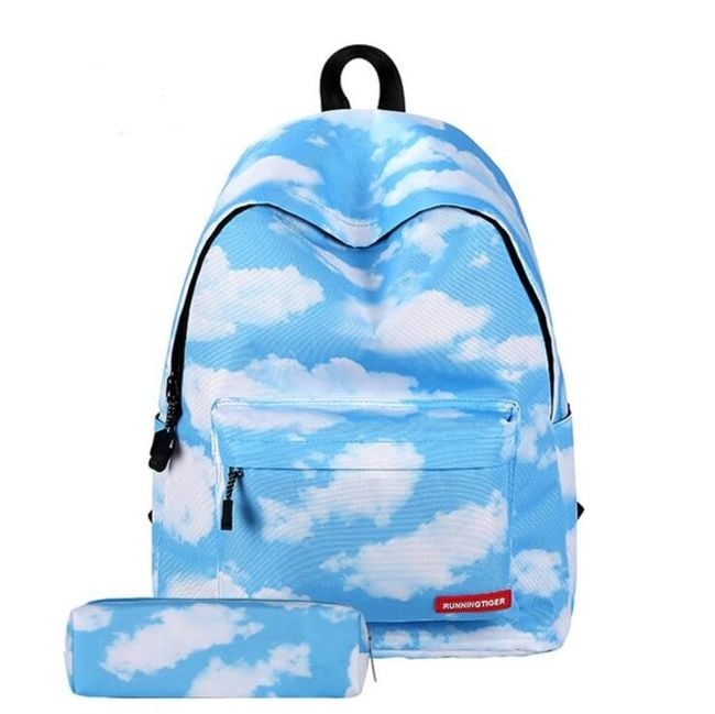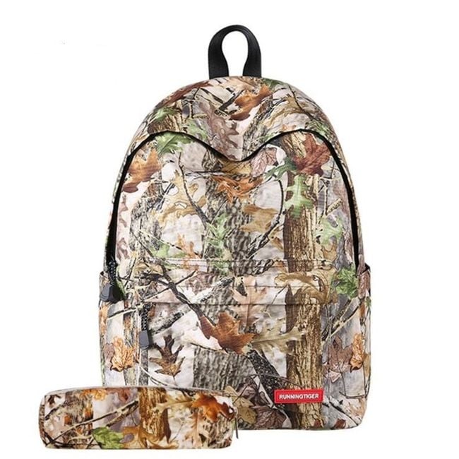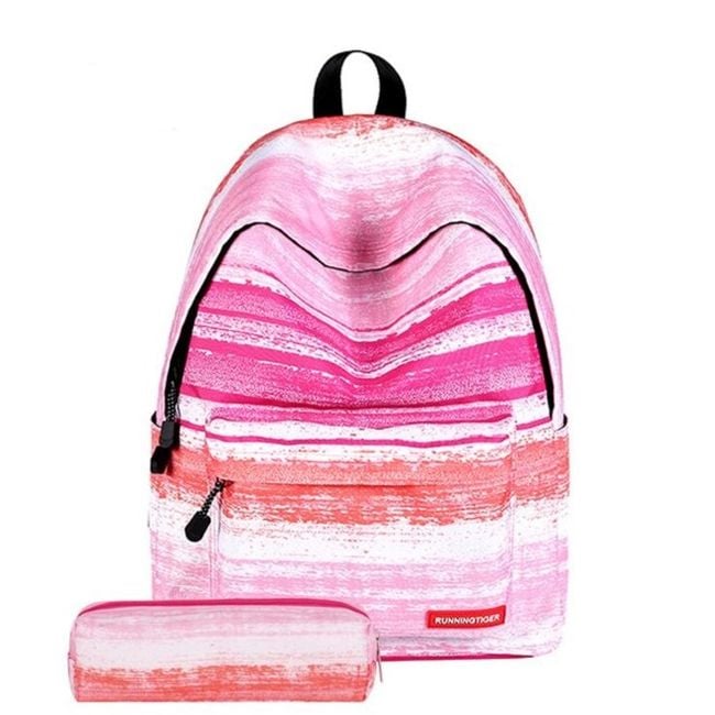 The set includes a large backpack and a pencil case in the same design. The backpack has one main compartment, which is divided into four additional ones, and a front pocket suitable for a pencil case or other small items, as well as side pockets for drinks.