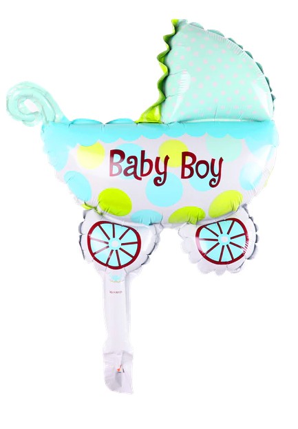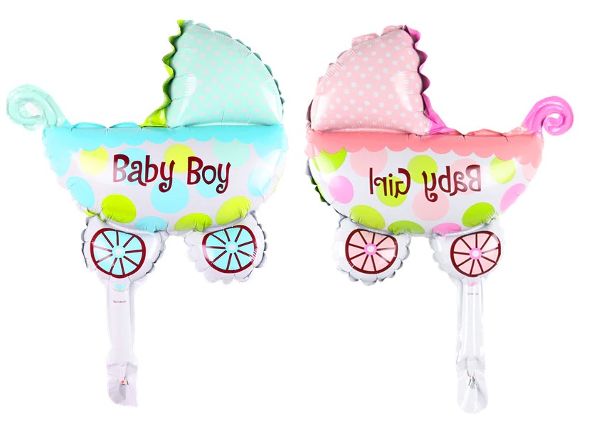 Celebrate the birth of a child with these stroller-shaped balloons featuring the text Baby Girl and Baby Boy.