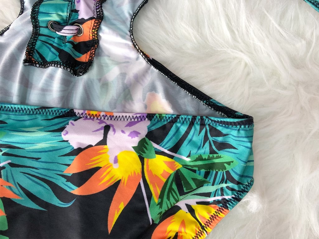 The swimsuit features a beautiful, summery floral pattern and has a classic tie design. It is also adorned with cutouts on the sides. A lovely swimsuit that is perfect for any swimming pool or beach.