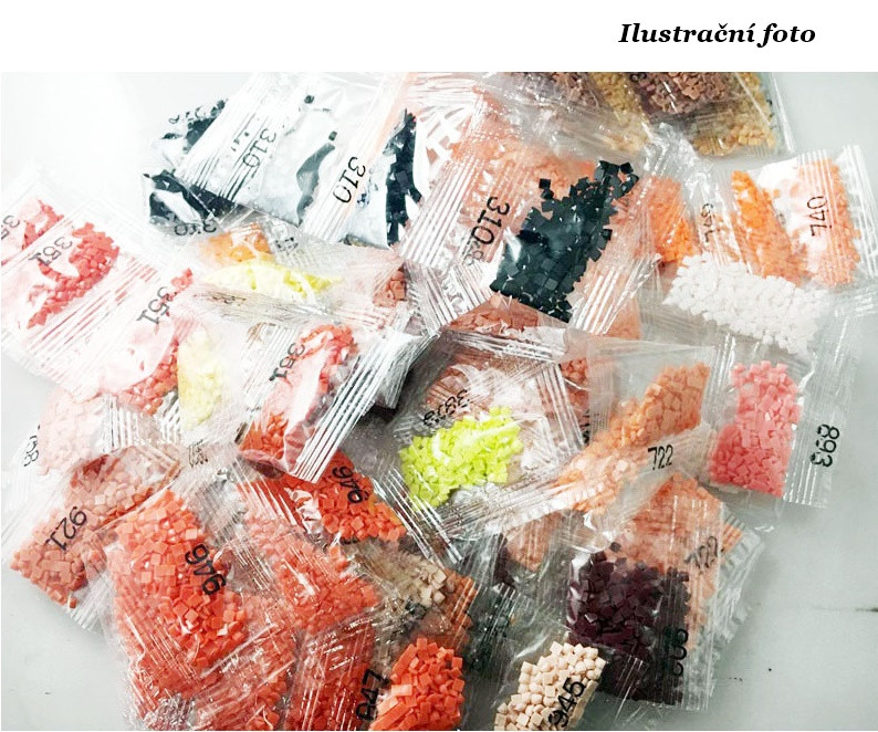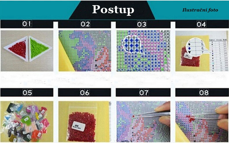 The creative set includes a clear template with an adhesive surface, into which coloured beads are placed using the included tweezers according to the instructions (corresponding symbols in the legend, see illustrative photo). The template is covered with a protective film. For easier work, always uncover only the part you are currently working on.