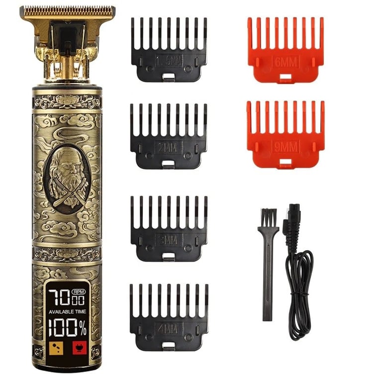 Package contents: 1x trimmer, 1x USB charging cable, 6x attachments, 1x cleaning brush