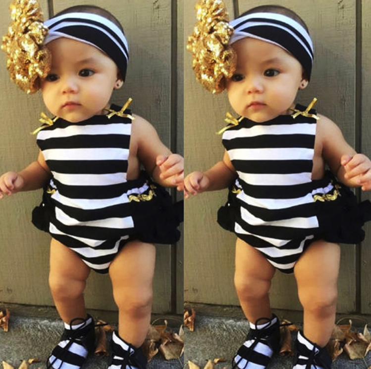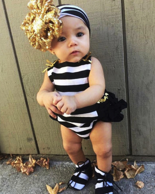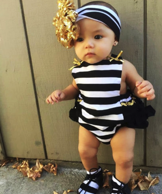 Beautiful cute striped baby bodysuit with a golden bow.