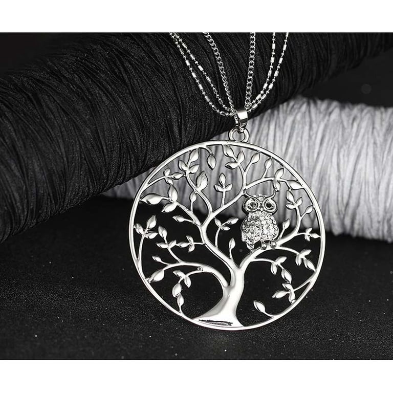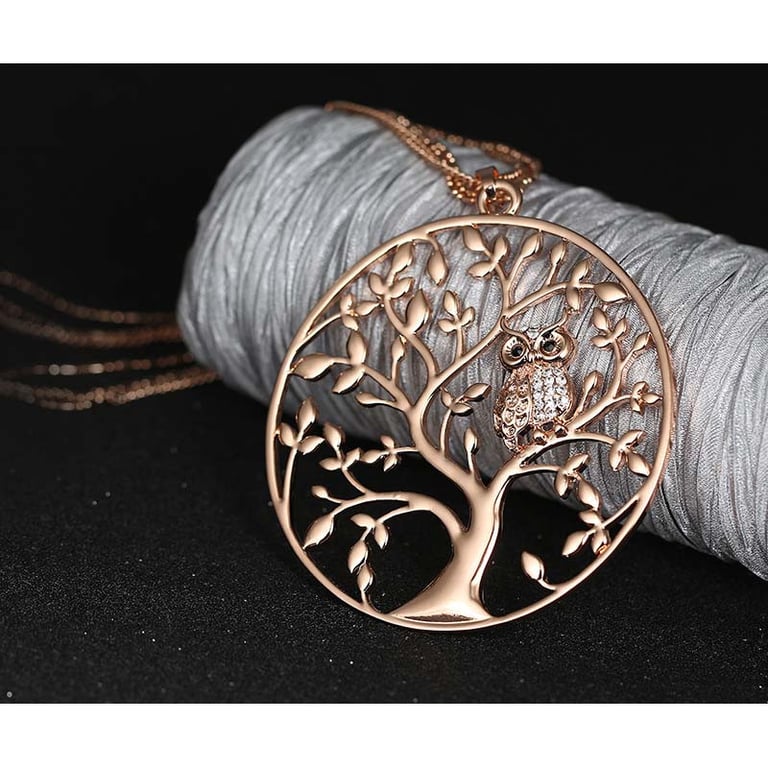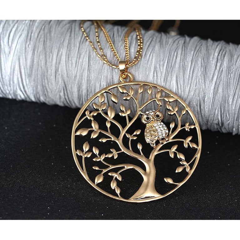 Stylish necklace featuring a tree of life motif and a small owl adorned with gemstones.