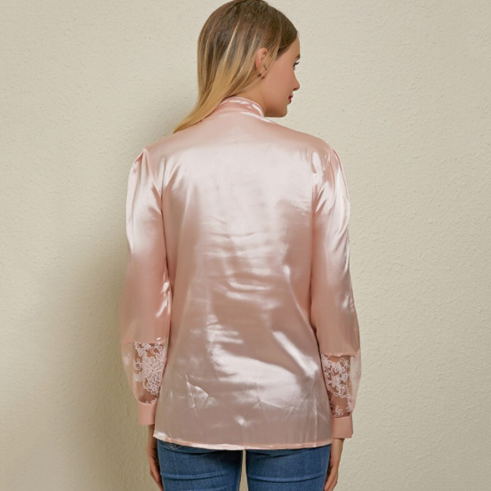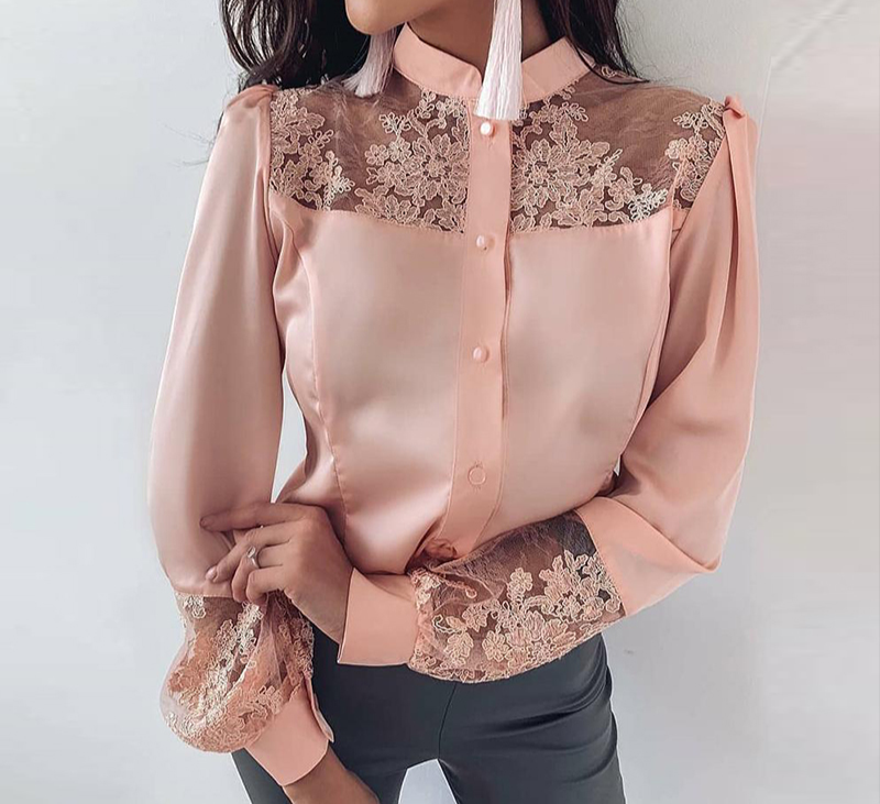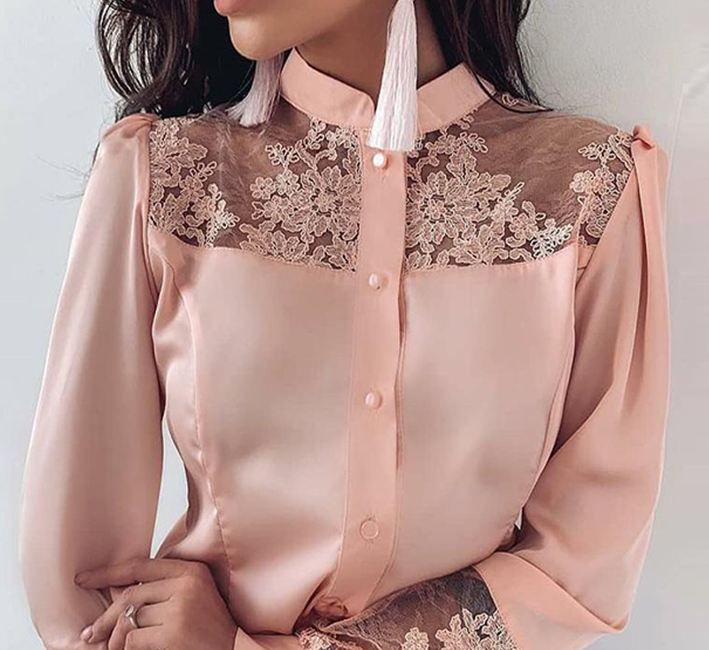 Beautiful pink button-up women's blouse with long sleeves and lace