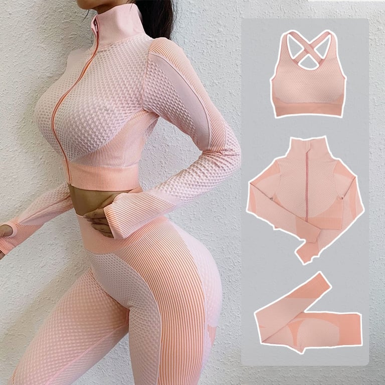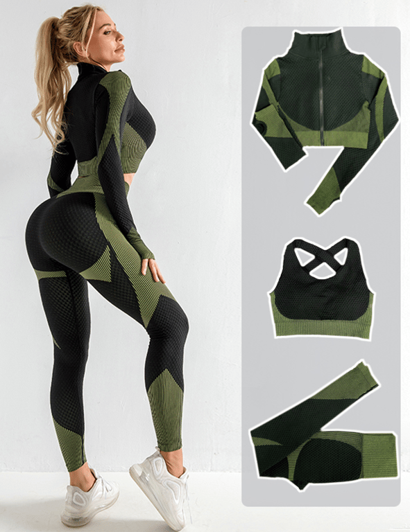 A fashionable sports set consisting of long leggings, a sports bra, and a zip-up crop top hoodie. The leggings feature a popular high waist, which every woman appreciates, are breathable, and made from a pleasant material. The bra has beautifully designed crossed straps and is also very comfortable. The hoodie has a zip fastening up to the neck and is cropped in length. There are several beautiful colour options to choose from. You needn't worry about not finding your perfect choice!