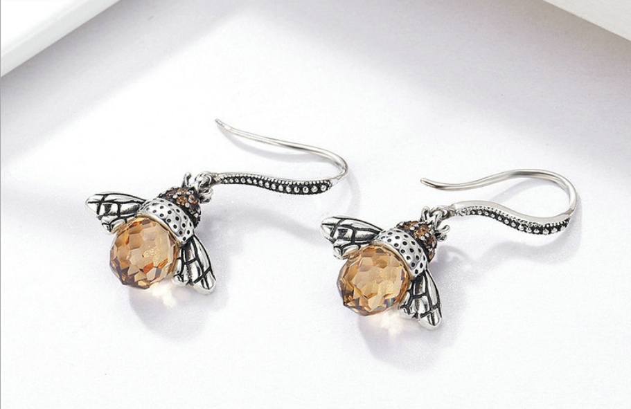 Beautifully richly decorated dangling earrings in the shape of bees with zirconia