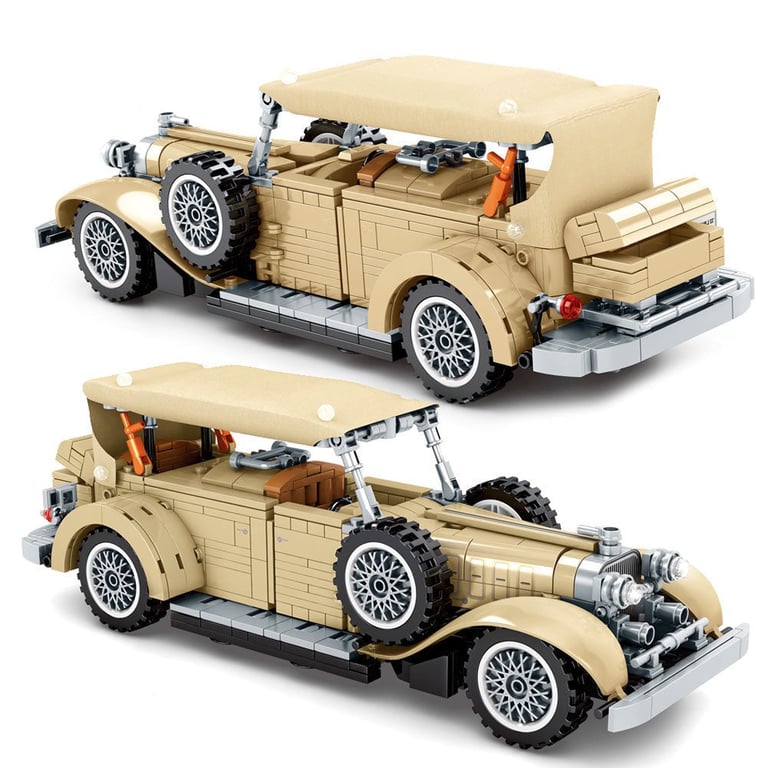 The beige pull-back retro car building set is compatible with Lego building sets.