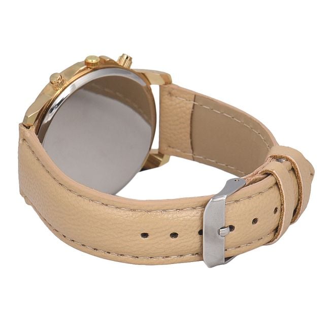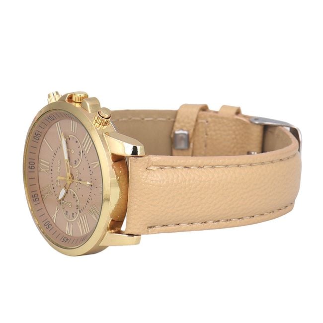 The watch in a soft beige shade will show you the time with the help of Roman numerals.