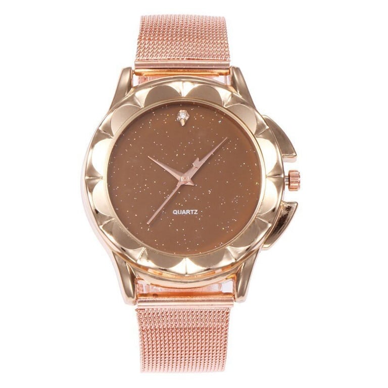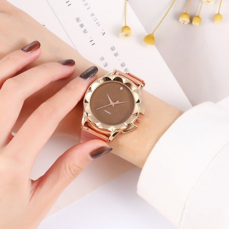 Women's watch with an adjustable metal strap. Coloured dial without numbering. In a metallic frame with glitter.