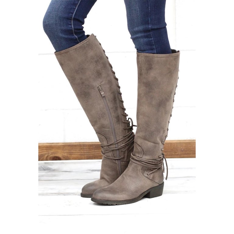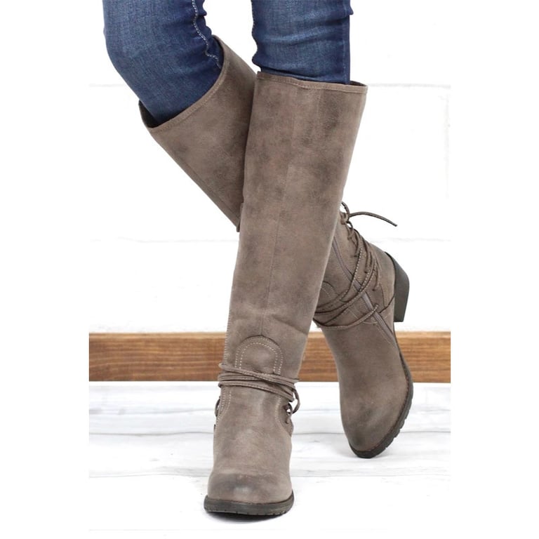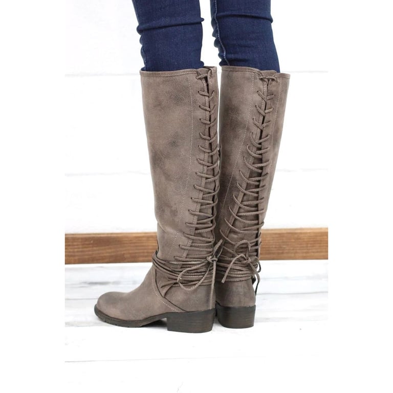 Women's high boots with a low wide heel. The boots feature a round toe, a zip fastening, and lacing at the back.