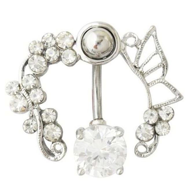 Navel piercing with a butterfly and rich embellishments is available in white or pink.