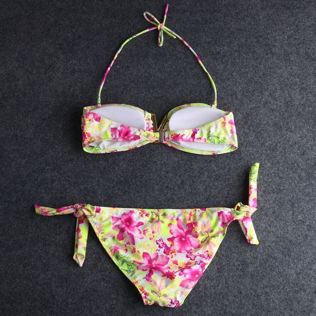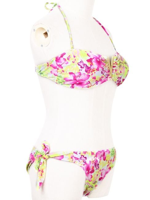 Women's two-piece swimsuit with a floral pattern and lacing.