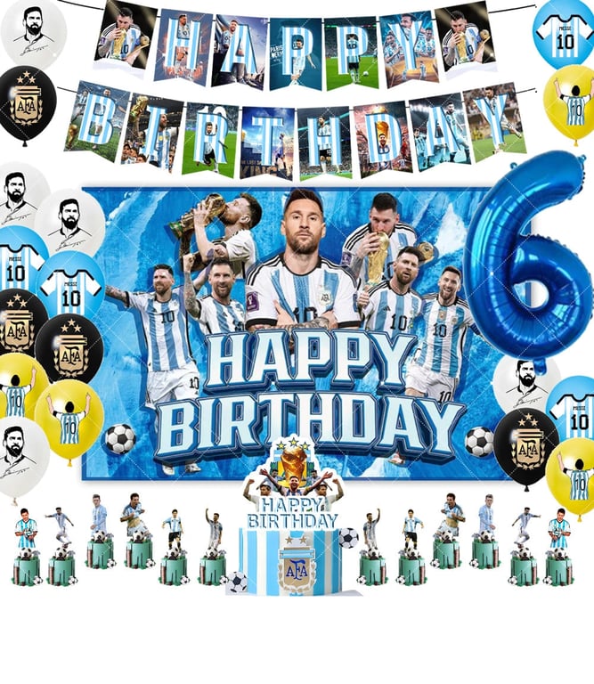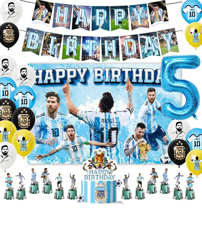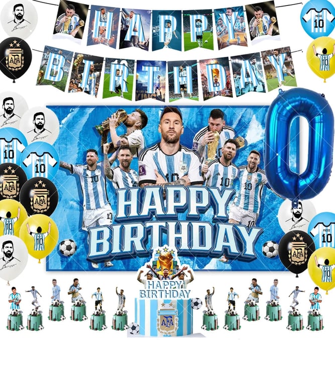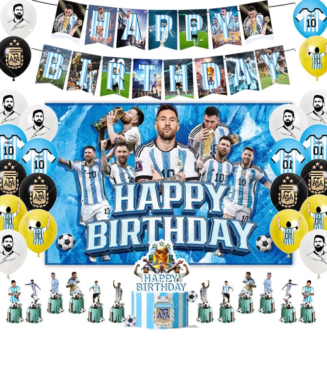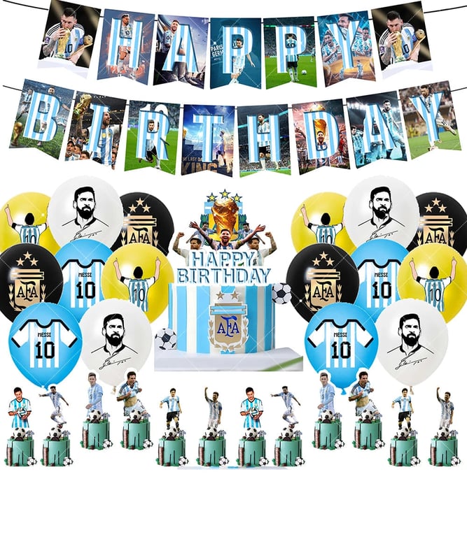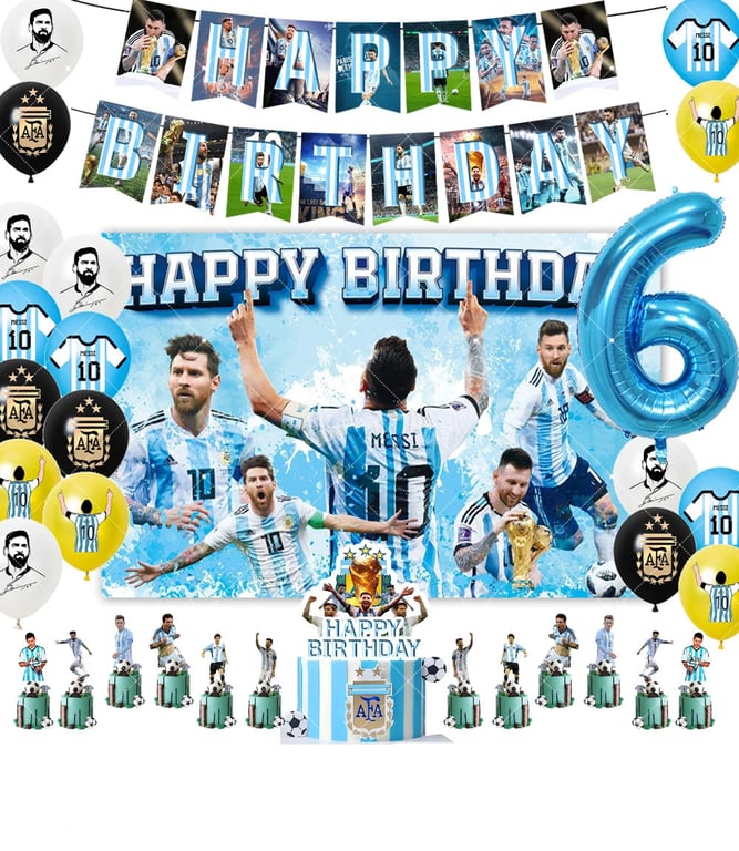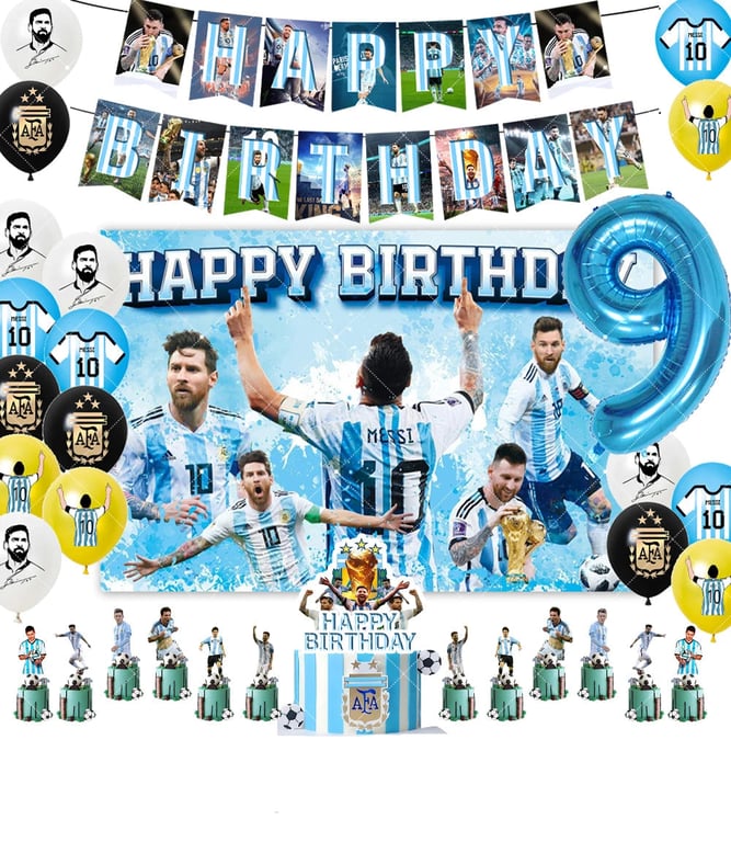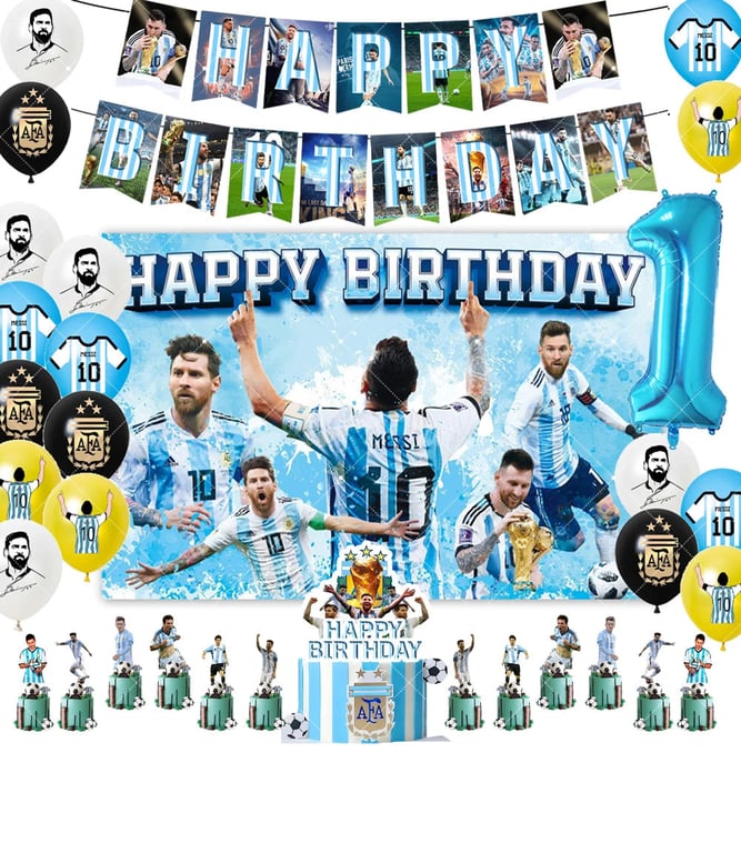 Birthday football party set with Lionel Messi balloons. Contents of the package: see image. The banner measures 120 x 90 cm.